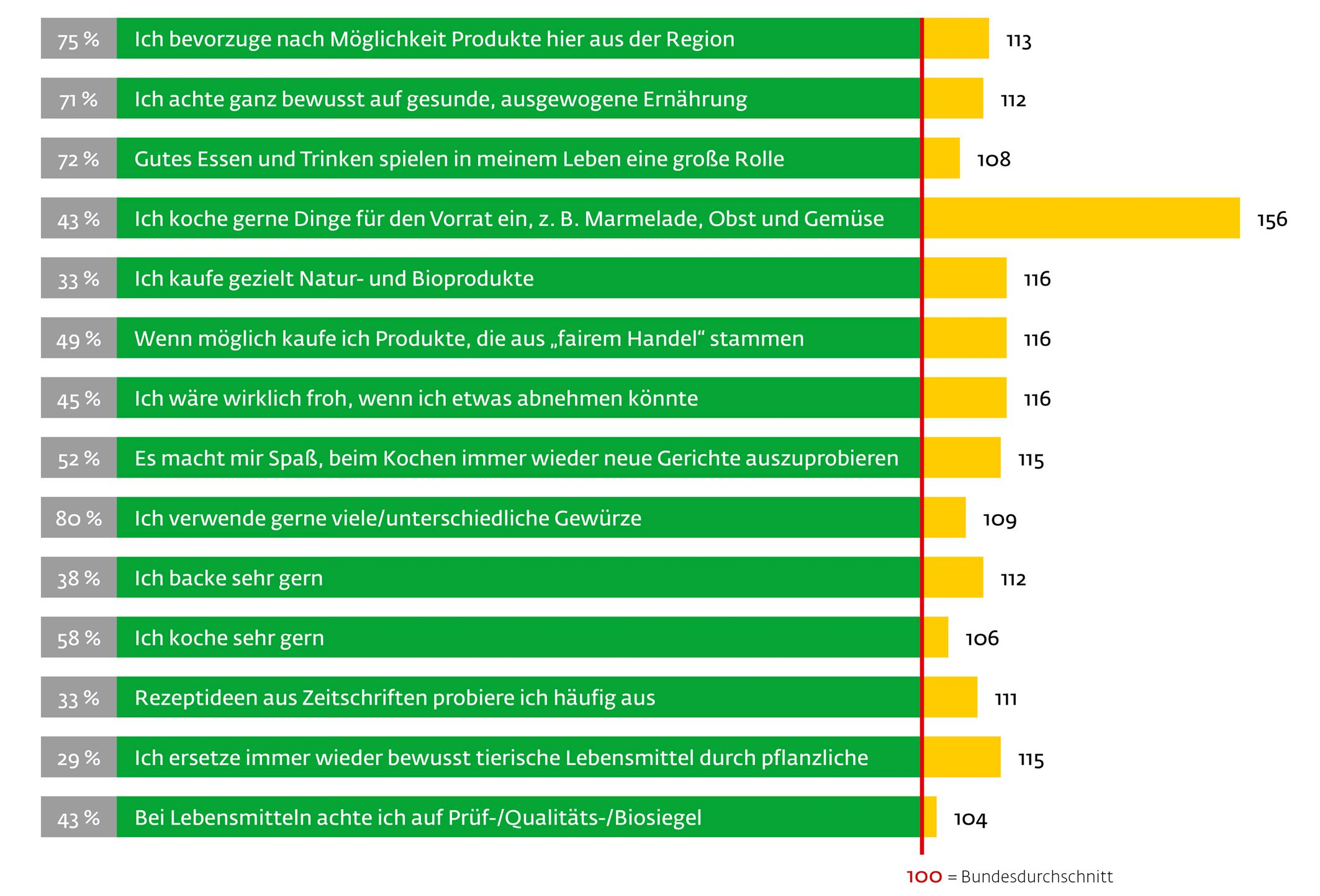 Unsere Zielgruppe achtet sehr und auch wieder überdurchschnittlich auf gesunde Ernährung, gerne auch bio und fair. Es werden häufig neue Rezepte ausprobiert und es wird abwechslungsreich gekocht.So sagen z.B. 75 % der Zielgruppe, dass sie nach Möglichkeit Produkte aus der Region bevorzugen, womit sie 13 % über dem Durchschnitt der Bevölkerung liegen: