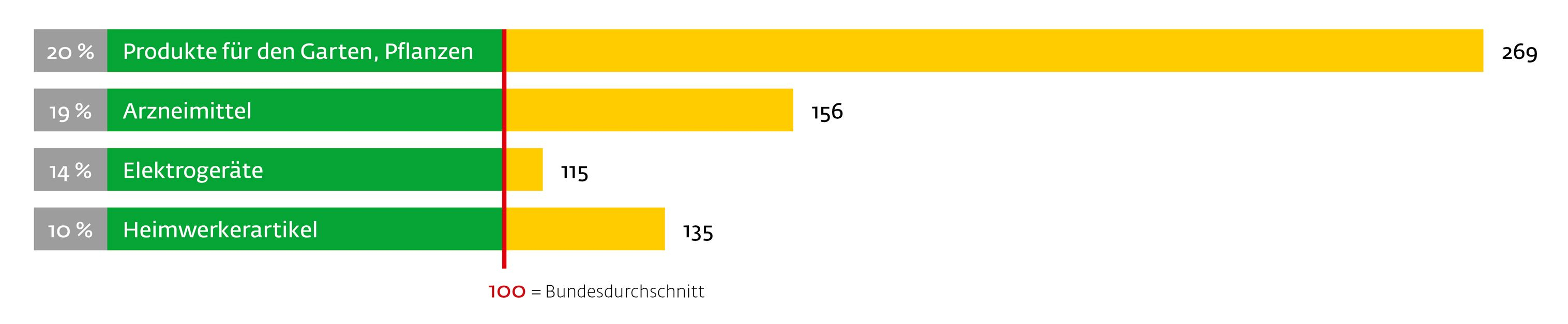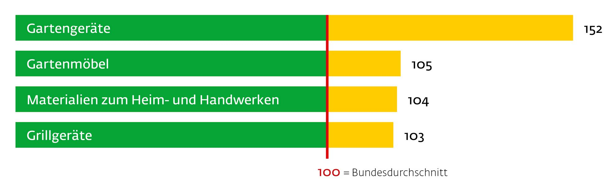Die Kleingärtner halten einen deutlich überdurchschnittlichen Bestand an Heimwerker-geräten im Haushalt vor, hier eine Auswahl der deutlichsten Abweichungen zum Schnitt (= 100) mit prozentualer Häufigkeit der Nennung: