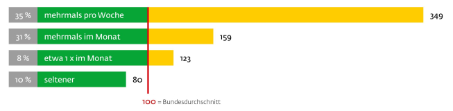 Der Kleingarten ist ein kommunikativer Rückzugsort. Hier kann man allein Ruhe und Erholung finden oder mit anderen Menschen zusammenkommen und sich austauschen. Die Anziehungskraft des Gartens weitet sich natürlich auch auf die Familie und Freunde aus. Statistisch kommen auf jeden Kleingärtner mehr als vier weiter Nutzer des Gartens (Nennung in %).